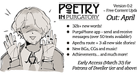 - March 29, 2024 by Tymedust Games20#poetry in purgatory, #update, #release date, #0.2, #content, #purgaphoneRise and shine, Dwellers! Long have you waited, and your patience is about to pay off... behold ! That's right, everyone! 0.2 is going to hit you like a Guide-shaped brick in little more than a week,... Continue reading